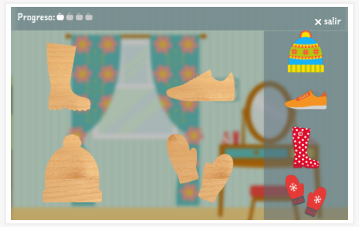 Si una imagen se ha arrastrado al cuadro correcto, se pronuncia la palabra correspondiente (con el artículo). Después de que se hayan colocado 4 imágenes, el niño oye un aplauso. Las imágenes se resaltan una a una y se pronuncia nuevamente la palabra correspondiente.